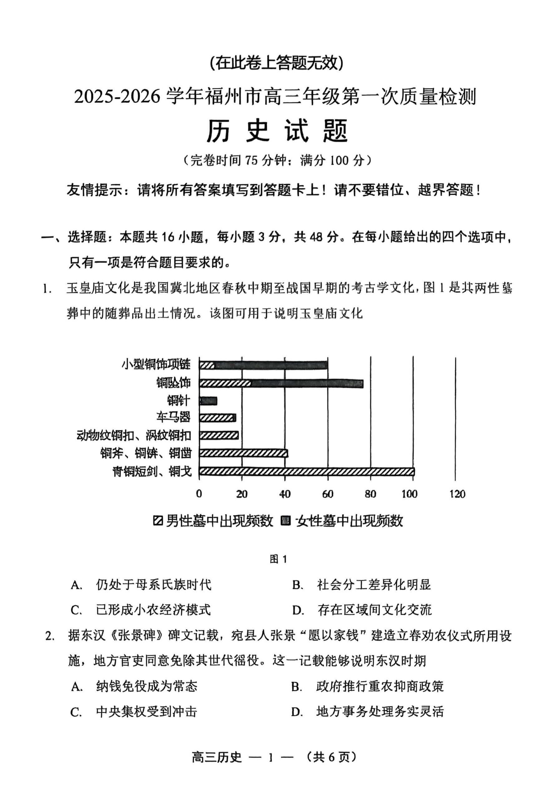 - 玉皇庙文化是我国冀北地区春秋中期至战国早期的考古学文化,图 1 是其两性墓葬中的随葬品出土情况。该图可用于说明玉皇庙文化