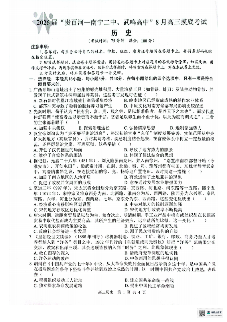 2026 届“贵百河一南宁二中、武鸣高中”8月高三摸底考试历史试题(含答案)