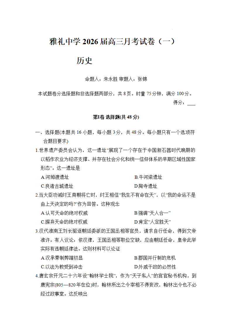 一、选择题 (本题共 16 小题,每小题 3 分,共 48 分。每小题只有一个选项符合题目要求)