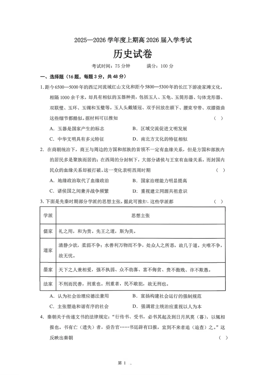 本次为大家整理的是2026届四川省成都七中高三上学期入学考试-历史(含答案)(共10页),高清完整版PDF下载。这套试卷贴合2026届新高考历史命题方向,覆盖高中历史核心考点,适合高三同学一轮复习刷题自测、查漏补缺,也可供高中历史老师作为复习备课资料使用。